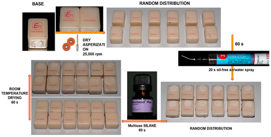 The bonding surface of the ENA block was prepared for bonding following the sequence shown in Figure 2C–E and Figure 3. For standardization, only 4.9% (5%) hydrofluoric acid etching gel from the VITA ADIVA kit (HF5) (Vita Zahnfabrik, Bad Säckingen, Germany) was used to etch all acid-sensitive surfaces involved in the study (20 s, SU group; 60 s, ENA group), according to the manufacturer’s instructions. The blocks were etched in pairs to prevent over-etching, and the etching time was controlled using a stopwatch. The treated surfaces were thoroughly cleaned using oil-free water spray for 20 s and then dried using oil-free compressed air for 10 s. The hybrid ceramic was primed with Vita ADIVA C-Primer (Vita Zahnfabrik, Bad Säckingen, Germany) in the control group (Figure 2F), and with a universal silane-containing primer (Monobond Plus, Ivoclar Vivadent) in the other groups [39,50] (Figure 3). Primers were applied using a microbrush and allowed to react for 60 s. If not completely dried after 60 s, air-drying was performed using an oil-free spray.
