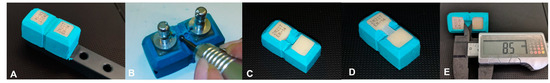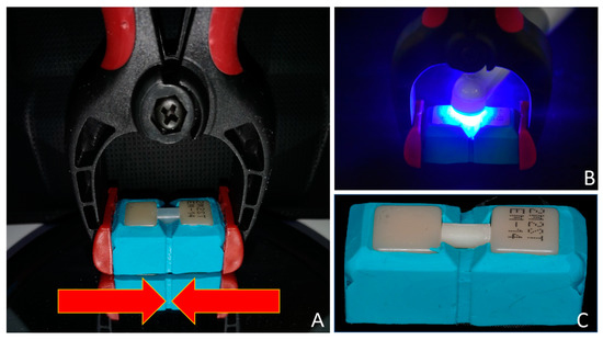 The excess cement was immediately removed using a microbrush. A constant pressure (0.5 kg) was applied during cement polymerization using a pinch spring (Figure 7A–C). The interfaces were light-cured for 10 s through each block and then in the middle of the cylinder for a total of 30 s using an Elipar S10 curing unit (1200 mW/cm2; 3M ESPE) within the accepted procedure [30]. Radiant exposure was ensured by prior calibration of the light-curing device using a radiometer. The compressive force was maintained for 10 min, leaving the material to self-cure.