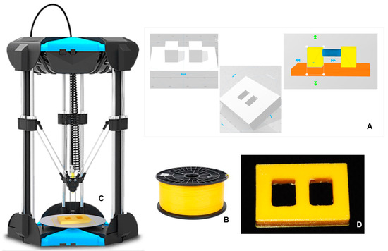 Steps of the polylactic acid (PLA) base design and fabrication. (A) design steps; (B) PLA coil; (C) PLA base in the printing process; (D) PLA base just printed.