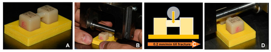 Specimen mounted on the polylactic acid (PLA) base ready for mechanical testing. (A) specimen inserted in the PLA base; (B) specimen being positioned on the platform; (C) basic scheme of the test; and (D) initial contact with the specimen and data registration.