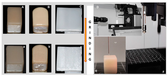 Substrates and equipment used for surface energy determination. (A,a) Enamic; (B,b) Suprinity; (C,c) Y-ZT blocks, as provided and after grinding; (D) Y-ZT block positioned for measurements; (E) 1 µL of water dropping on a ground Enamic block; and (F) detail of the reference platform and injection system.