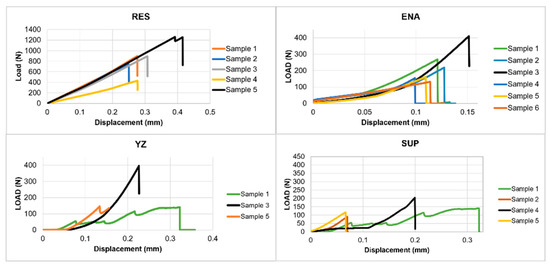 Graphic representation of specimen behavior under load of the control (RES), ENA, SUP, and Y-ZT groups.