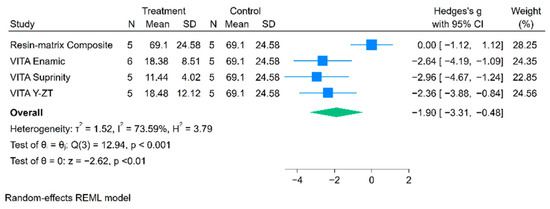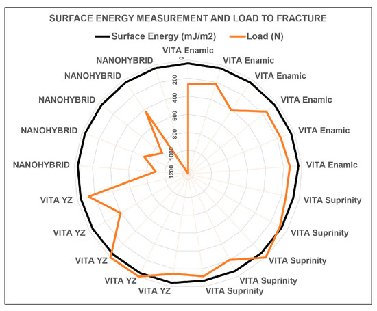 All data were analyzed to verify the achievement of the proposed goals. The mean load to fracture (N) and shear stress (MPa) with standard deviation (SD) were calculated for each group. A meta-analysis was conducted using the type of CAD-CAM restorative material to evaluate the shear stress between materials after calculating the difference between means and effect sizes (random-effects model; α = 0.05; 95% CI; Z-value = 1.96). The failure mode was determined by microscopic observation and was correlated with the maximum load to fracture of the specimens. A radar graph correlates the surface energy with the load to fracture.