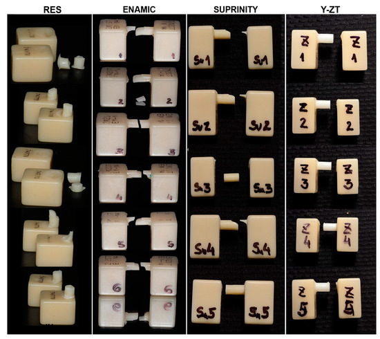 As shown in Figure 13 and Figure 14, the observation of the fractured specimens reveals the different mechanical behaviors of the assessed ceramics. From the observations in Table 3, failed adhesion is the unique failure mode for the Y-ZT group. The unique failure mode was cohesive in the RES group, either in the cylinder or the base, and sometimes simultaneously. Figure 15 shows a comprehensive schematic of the failure mode.