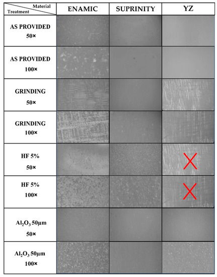 Microscopy observation (50× and 100× ampliation) of the CAD-CAM ceramics after different surface treatments as provided by the manufacturer, ground by coarse disk, 5% hydrofluoric acid for 60 s (HF 5%), aluminum oxide blasting (Al2O3 50 µm). The red cross identifies a null effect.