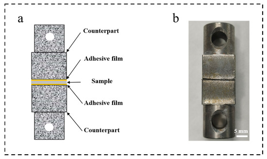 The PVTF coatings on the Ti substrate were prepared by following the method [27]. Briefly, 18 wt% PVTF powder was dissolved in DMF and stirred magnetically for 2 h to obtain the completely dissolved solution. The PVTF solution was cast on Ti substrate, then prepared by the annealing method, finally forming the crystallization of PVTF at 210 °C for 1 h. The cyanoacrylate adhesive, which was the liquid condition in native, was used to coat one of the sides of mold and the sample. After the solvent in cyanoacrylate adhesive evaporation, one of the sides of mold and the sample was preliminarily bonded. The other sides of the mold were coated with the sample following the above-mentioned method. The cyanoacrylate adhesive formed the adhesive film, and the specimens were made successfully overnight. As shown in Figure 1, the specimens were made for mechanical stretching tests.