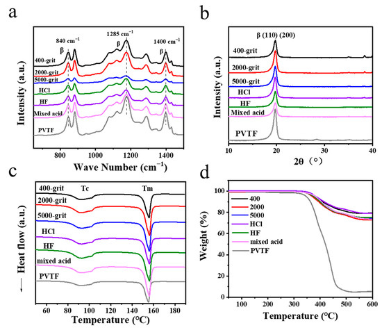 PVTF (70/30) powder was purchased from Piezotech (Pierre-Bénite, France). N, N-dimethylformamide (DMF, 99.5%), hydrochloric acid (HCl, 36%), nitric acid (HNO3, 68%), hydrofluoric acid (HF, 40%), acetone (99.5%), and absolute ethanol (99.7%) were supplied from Sinopharm Chemical Reagent Co., Ltd. (Shanghai, China). 400-, 2000- and 5000-grit sandpapers were bought from Xinge Abrasive (Suzhou, China). Ti metal with thickness of 100 μm was obtained from Boti Titanium Products Co., Ltd. (Baoji, China).