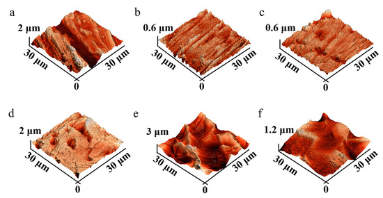To enhance the bonding strength of PVTF coatings, physical and chemical treatments were made for Ti metal surfaces. SEM images of Ti metal surfaces modified by physical treatment showed that Ti metal surfaces became increasingly smooth as the mesh number of sandpaper was increased (Figure 4a–c). Moreover, the surface of topography and roughness of these Ti metal surfaces were also revealed in AFM images (Figure 5a–c). AFM images showed that Ti metal surfaces with 400-grit, 2000-grit and 5000-grit sandpaper treatments had a series of gullies. With the number of sandpapers, the gullies on Ti metal surfaces became shallow. As shown in Table 1, the roughness of Ti metals presented the tendency to decrease, and the roughness of samples with 400-grit, 2000-grit and 5000-grit sandpaper treatments were 557.4 ± 75.4 nm, 320.9 ± 18.2 nm and 216.3 ± 76.1 nm, respectively. As shown in Figure 4d–f, the morphology of Ti metal surfaces was significantly diverse with chemical treatments. AFM images showed that a Ti metal surface treated by HCl solution had small holes, a Ti metal surface treated by HF solution formed many irregular pits, and a Ti metal surface treated by mixed acid solution formed regular pits (Figure 5d–f). After treatment with HCl, HF, and mixed acid solutions, the roughness of the Ti metal surfaces were 440.3 ± 51.6 nm, 691.9 ± 41.2 nm, and 464.2 ± 54.9 nm, respectively. In previous studies [31,32], it was reported that the roughness was related to the hydrophilicity/hydrophobicity. For this reason, the static water contact angle (WCA) of Ti metal surfaces was also measured. As shown in Table 2, the WCA of Ti metal surfaces treated with 400-, 2000- and 5000-grit sandpaper were 92.3 ± 3.1°, 80.5 ± 2.9°, and 78.9 ± 0.9°, respectively. The results were basically consistent with the roughness, indicating that the hydrophilicity increased with the decrease of roughness obtained by the physical method. In addition, the WCAs of the Ti metal surfaces were 54.7 ± 2.7°, 15.0 ± 2.7°, and 9.9 ± 1.9° after treatment with HCl, HF and mixed acid solutions, respectively. The results showed an inconsistent trend compared to the above-mentioned results, which might be due to the fact the hydrophilicity/hydrophobicity obtained by the chemical method was influenced by other factors, e.g., chemical bonds [33,34]. It was worth noting that the relationship between roughness and WCA of Ti metal surfaces with different physical and chemical treatments was exhibited in Figure S1, Supplementary File.