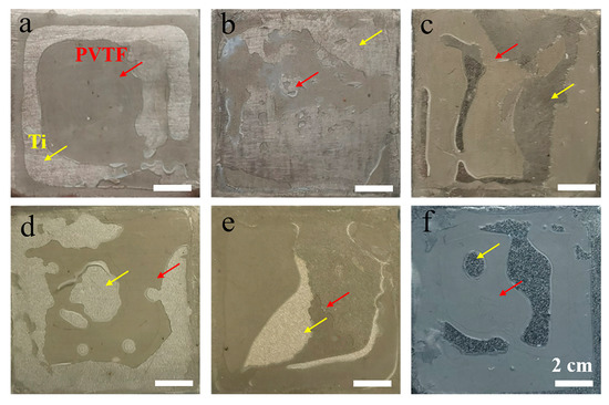 The morphology of fracture of samples after stretching. The fracture of samples treated by (a) 400-, (b) 2000-, (c) 5000-grit sandpaper, (d) 36% HCl, (e) 10% HF and (f) mixed acid solutions for 1 min, respectively. Red arrows represented PVTF, yellow arrows represented Ti metal.