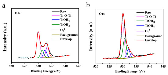 To further explore the possible mechanism of the high bonding strength of the PVTF coatings, XPS spectra were employed to detect functional groups on the Ti metal surface, especially for the OH group, which could theoretically form hydrogen bonds with the F atom of PVTF chains. As shown in Figure 8a,b, an XPS of O 1s peak, which was to analyze the OH group, was divided into four subpeaks: the peak near 529.9 eV was attributed to the O in the surface oxide lattices (denoted by TiO2), the peak near 531.4 eV was assigned to the O in the basic TiOHB (denoted by TiOHB, bridging OH group), the peak near 532.2 eV was attributed to the O in the acidic TiOHT groups (denoted by TiOHT, terminal OH group) [38] and the peak near 533.4 eV was assigned to the O22− groups [39]. Since different types of OH groups could result in different polarities, it was very important to calculate the area ratio of TiOHT/TiOHB, which could represent the surface property of the material [40]. The relative peak area ratios are shown in Table 4. The results showed that 5000-grit sandpaper and mixed acid group of TiOHT/TiOHB were 1.00 and 0.43, respectively. More importantly, the total OH group concentration of mixed acid group was 42.5, which was more than 5000-grit sandpaper group, 30.02. That might explain why the bonding strength of the mixed acid group was higher.