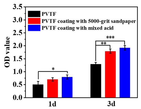 To understand whether the Ti metal surface being treated by physical or chemical methods had an influence on PVTF coatings, CCK-8 tests were used to evaluate the biocompatibility. With the PVTF serving as the control group, BMSCs were seeded on PVTF coatings with 5000-grit sandpaper and mixed acid solution treatment, and were cultured for 1 day and 3 days. As shown in Figure 9, compared with the control group, the OD value of PVTF coatings with 5000-grit sandpaper and mixed acid solution treatment had good biocompatibility, and showed no significant difference from each other. This indicated that physical and chemical methods had no effect on the biocompatibility of PVTF coatings.