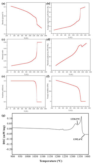 Thermophysical parameters as a function of temperature, (a) Temperature—density. (b) Temperature—average coefficient of expansion. (c) Temperature—Poisson’s ratio. (d) Temperature—thermal conductivity. (e) Temperature—solid fraction. (f) Temperature—Young’s modulus. (g) DSC curve.