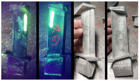 Experiments are conducted on blades with hot cracks produced by AECC Southern Industry Company Limited. The cracks are detected using fluorescence detection, while the macroscopic grain distribution is observed after the sample is corroded with hydrochloric acid, and it is found that the hot crack is generated in the middle and upper part of the exhaust side of the blade body; usually a crack penetrates the blade body. The fluorescence detection and macroscopic grain corrosion results are shown in Figure 7. The pulling speeds are 2 mm/min, 6 mm/min, and 10 mm/min for DZ22B superalloy blades, which are the same as those actually produced, and cross-sectional samples are prepared by taking the middle and upper positions of the blade body. SEM images of the blade pores after the corrosion process are obtained at various pulling speeds (Figure 8 and Figure 9).
