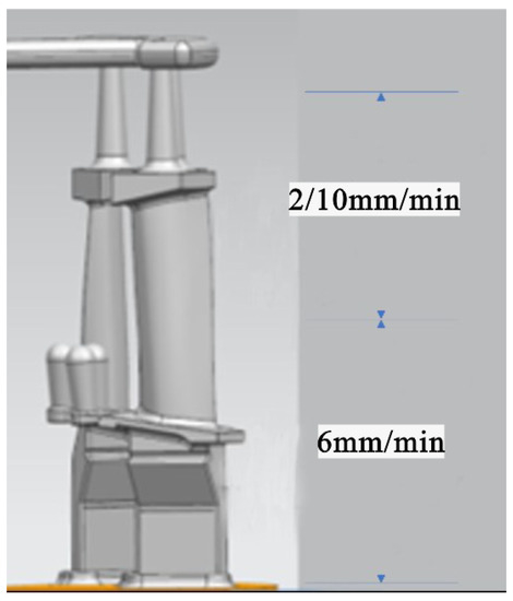 Turbine blades are often prepared at a single pulling rate in the industrial production of directional solidification. In the previous work, the influence of a constant pulling rate on the shape and temperature gradient of the solid-liquid interface, as well as the influence on the structural performance of blades, were systematically analyzed. Appropriate pulling speed can reduce the secondary dendrite spacing of microstructure, improve casting performance, reduce pore formation, and reduce the thermal crack sensitivity index. The uniform speed pulling law obtained above is applied to the exploration of the variable speed pulling process: the initial pulling rate is 6 mm/min, the pulling height is 110 mm, the later variable speed is 2 mm/min or 10 mm/min, and the pulling height is not less than 180 mm, and the pulling speed scheme of different parts of the blade is obtained as shown in Figure 10.