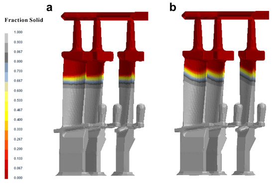 When the mushy area is in the upper position, the casting has just completed the deceleration pulling of 6 mm/min–2 mm/min or the accelerated pulling of 6 mm/min–10 mm/min, it can be seen that the mushy area of the upper part of the blade in Figure 12a is relatively flat, while the mushy area of the upper part of the blade in Figure 12b is concave, which will affect the solidification behavior of the upper part of the blade, making the solidification structure uneven and easy to form uneven stress, resulting in hot cracks.
