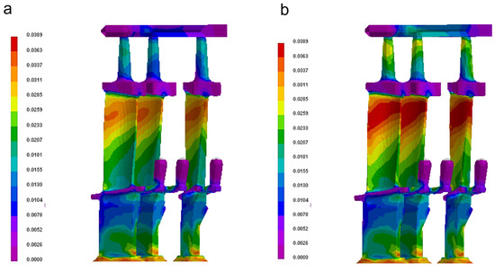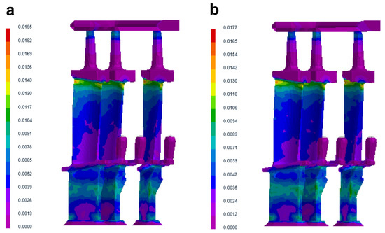 The color bars and corresponding numbers on the left side of the simulated image indicate the trend of the simulation parameters. In Figure 14, purple represents a small tendency for thermal cracking, while red represents a large tendency for thermal cracking. It can be seen from Figure 14 that the variable speed pulling rate of 6 mm/min–10 mm/min is larger than the variable speed pulling rate of 6 mm/min–2 mm/min, and the dark blue region is larger and the purple region is smaller, indicating that the area with a large thermal cracking tendency is wider. According to the simulation results of uniform pulling, it can also be seen that when the pulling rate is constant, the hot cracking tendency of the upper edge of the last solidified blade is greater, and the pulling rate should be reduced so that the last solidified part can be fully compensated, thereby reducing the thermal cracking tendency. Therefore, from the perspective of reducing the tendency of thermal cracking, a variable speed pulling rate of 6 mm/min–2 mm/min should be selected.