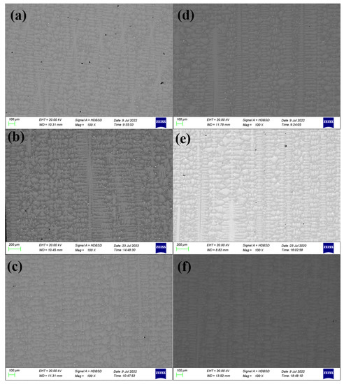 Secondary dendrite SEM diagram at the upper position of the intake end, (a) 6–2 mm/min. (b) 6–6 mm/min. (c) 6–10 mm/min. Secondary dendrite SEM diagram at the upper position of the exhaust end, (d) 6–2 mm/min. (e) 6–6 mm/min. (f) 6–10 mm/min.