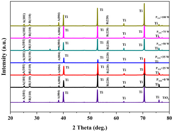 The diffraction patterns of the Mo/N–TiO2 nanotube films with different nitrogen doping concentrations are presented in Figure 3. The XRD analysis revealed distinct diffraction peaks ascribed to both TiO2 and the Ti substrate [27], suggesting that the fabricated TiO2 nanotube film is characterized by a thin structure and strong adhesion to the substrate. After being annealed at 550 °C for 2 h, the TiO2 films showed a mixed crystal structure. The peaks detected at angles of 25.3° and 37.9° corresponded to the diffraction peaks of the (101) and (004) crystal planes of anatase TiO2. The peaks at 27.6° (110) and 56.6° (220) were commonly considered as indicative peaks of the rutile phase. Based on the equation [28,29], the following is given:
