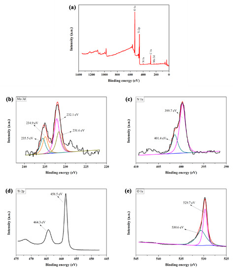 The XPS spectrum of Mo/N co-doped TiO2 nanotube array films with a TiN target sputtering power of 35 W: full spectrum (a) and the high-resolution spectrum of Mo 3d (b), N 1s (c), Ti 2p (d) and O 1s (e).