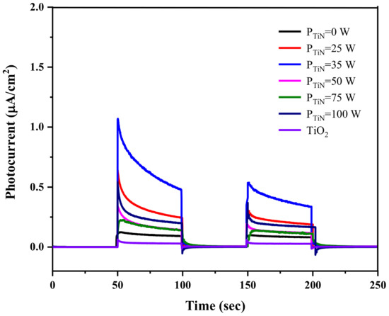 Figure 7 shows the photogenerated current density curves of Mo/N co-doped TiO2 nanotube array films with different doping concentrations when exposed to visible light. It is evident from the figure that the sample with TiN target sputtering power of 35 W excited more electronic transitions when exposed under visible light. The photogenerated carrier density exhibited a transient photogenerated current density of 0.50 μA/cm2, which was 5.5 times higher than that of the Mo-doped TiO2 nanotube array film and 16.7 times higher than that of the undoped TiO2 nanotube array film. The doping of Mo and N introduced donor–acceptor energy levels and altered the band structure. The narrowed band gap resulting from the doping of Mo and N could be recognized as the contributing factor to the enhanced photoelectrochemical performance. As the N content continued to elevate with increasing sputtering power, the photogenerated current density instead began to decrease, suggesting that there could be an optimum sputtering power to obtain the ideal N doping content. When the N doping concentration is at a high level, deep-level defects can be formed, which act as recombination centers [45]. Moreover, the excessive N doping may exert an adverse influence on the structure of the nanotubes, which also reduces the carrier mobility.