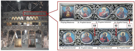 The metallic leaf is usually very thin (0.1–10 µm) and the embellished surfaces can be easily damaged, resulting in losses of the metal or cracking, which is due to environmental factors and aging of the underlying materials [2,3]. Probably due to the fact that it appeared degraded, the polychrome sculpture of the iconostasis was covered with paint imitating gilding (liquid bronze), hiding the details of the sculpture and affecting the overall aesthetic. The first coat of metallic paint was applied most probably during the conservation procedures in 1925, and the second was applied later, also using gold metallic paint. Such practice was well known and adopted not only in the Eastern Orthodox churches [4], but all around Europe, as reported in similar cases [2,5,6,7,8]. Since the last intervention, the appearance of the iconostasis has changed over time, manifested by the accumulation of adherent and non-adherent deposits on the surface, strong oxidation of the silvery paint applied to the sculpture, cracks, dislocations, and loss of sculptural elements. Considering all the facts, it was decided that the best approach, from a conservation point of view, is to remove the degraded overpainting and reveal the original polychrome pictorial layer. The methodology involved a multi-analytical approach consisting of documentation and examination of the morphology of the surfaces, stratigraphic layers, and constituent materials, followed by the overpaint removal by combining the action of a laser and chemical solvents.
