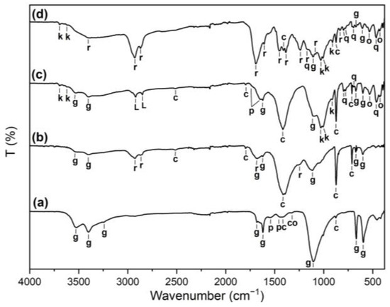 ATR-FTIR analysis of the paint and the ground layers of part of the samples: (a) S1—ground layer, (b) S3—ground layer, (c) S1—paint layer, and (d) S3—paint layer. Legend: k—kaolinite; g—gypsum; c—calcite; q—quartz; o—iron oxides; p—proteins; L—lipids; r—resin; co—calcium oxalate.