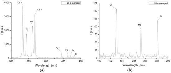 The LIBS results obtained from averaging the spectra from 20 pulses confirmed the presence of the following chemical elements: Ca, Al, Fe, Na, K, Si, Sr, H, and C, yet no S lines were detected probably due to the fact that sulphur is present in low concentration, below the spectrometer’s limit of detection (Z300 SLOD = 1%–2%). The LIBS spectra are presented in Figure 4a,b for the main elements identified. Traces of Ti, Mg, Mn, and Li were detected as well, which were linked to the earth and clay minerals in the composition of the materials. Potassium was also found as a trace element and might be associated with soiling deposits or the formation of salts on the surface [34]. These findings are in accordance with the FTIR interpretation, showing the presence of gypsum, calcite, and iron oxides.