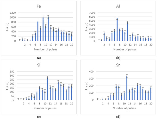 LIBS stratigraphy was performed in order to obtain a glimpse of the distribution of the chemical elements by analysing each of the 20 pulses (Figure 5a–d) [35,36]. It was observed that the most analysed elements started to count only from the 5 to 6th pulse, with a peak between the 7th and the 11th pulses, corresponding to the metallic overpaint. This can be an indication that the metallic overpaint layer is covered with another layer of organic or synthetic nature, as LIBS detects only trace elements. Starting with pulse 12 till the end of the series, the distribution tends to have a quasi-constant shape for most of the elements pictured, which can be attributed to reaching the ground, as can be observed in Figure 5c,d that presents the Si and Sr distribution.