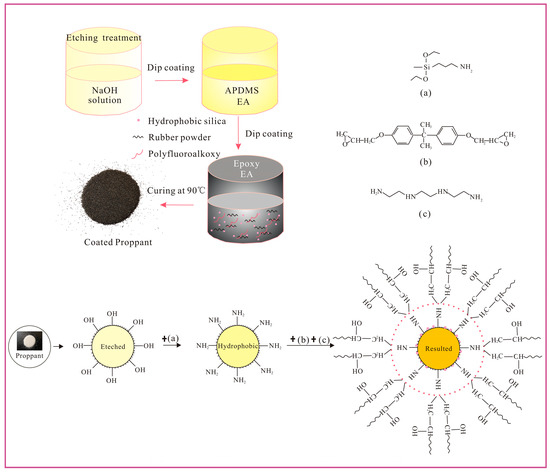 Preparation of superhydrophobic coating: The superhydrophobic coating was prepared via the rapid solution immersion method. Firstly, 10 g of epoxy E44 was dissolved into a certain amount of ethyl acetate solution; then, 3 g of PFA and 3% hydrophobic SiO2 nanoparticles were added into the mixture and under ultrasonic oscillation for 1 h. In order to improve the abrasion resistance, 19% rubber powders was added, and then ultrasonic oscillation was repeated for 20 min. Subsequently, the Z-proppant was immersed into the prepared epoxy resin solution for 3 min. Finally, the coating of the proppant was cured at 90 °C for 3 h. The curing reaction of epoxy resin and amine curing agent occurred based on the chemical bonding connection between the epoxy group and amino group, and then the achievement of proppant coating was indicated by its transformation into black particles with high sphericity. The cost of this coated proppant is about 310 USD/m3, which is a very reasonable cost for use to develop any oil field. Additionally, the molecular structures of some of the chemicals used in this work and the complete process of fabricating the sample are shown in Figure 1.