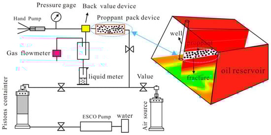 The actual WPC of a fracture layer packed with coated proppant was tested and compared with that of a fracture layer packed with conventional proppant under the same gas permeability conditions. In the test, the oil permeability of the layers packed with proppants was 3000 mD (1 mD = 10−3 μm2), and the differential pressure of water injection was between 0.2 and 6 MPa. The experimental flow chart is shown in Figure 2. The specific test steps were as follows: (1) put the conventional proppant (40 mesh) into a proppant pack device; (2) test the gas permeability of the gravel-packed model; (3) test the water permeability of the proppant-packed model for various pressures; (4) replace the conventional proppant with the coated proppant (here, it is necessary to adjust the packing method with the coated proppant continually until the gas permeability equals the gas permeability tested in step (2), then repeat the corresponding water permeability test; (5) after the WPC test, use the air flooding sample, open the sample valve, and let it stand at 90 °C to evaporate the remaining water; (6) test the oil flow quantity with different pressure differences.