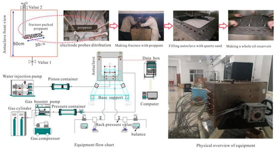 As illustrated in Figure 3, a large-scale 3D experiment was carried out using resistivity probes to develop an oil reservoir. The size of the autoclave in this study was 50 cm × 50 cm × 50 cm (length, width, and height, respectively). The permeability of the layer packed with coated proppant was 3000 mD. There were 25 sets of electrode probes placed inside the autoclave. The water-plugging and production-increasing effects of the layer packed with coated proppant were evaluated by measuring the change in the water saturation field of the water-flooded oil reservoir during production. Based on the parameters of Well DQSL-II-142 (the well had a length of 300 m and a width of 200 m; the average porosity was 0.214; the fracture length was 30 m; and the oil production was 11.2 t/d), and according to oil field similarity criterion, simulation parameters were determined as follows: the length and the width of the fracture were 30 and 1 cm, respectively; the wellbore diameter was 6 mm; the packing thickness of the proppants was 1.4 cm; and the production pressure difference was 0.4 MPa.