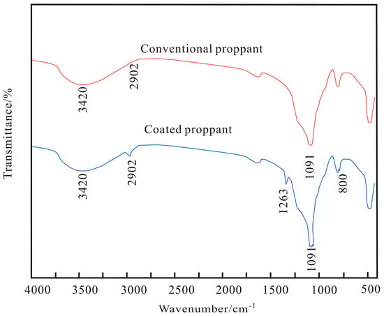 In order to examine the change in the surface groups after surface hydrophobic treatments, the FT-IR spectra of the hydrophobic proppant were compared with those of the pristine one. The result is shown in Figure 4. After the hydrophobic treatment of the proppant, a new peak at 2902 cm−1 was observed, which we assigned to the C–H stretching vibration, and indicated the formation of epoxy resin coatings. In addition, the FT-IR spectrum of the hydrophobic coating presented characteristic absorptions around 1263 and 801 cm−1, corresponding to C–N stretching vibration and N–H deformation vibration. Amino silicone oil (APDMS) was coated onto the surface of the proppant, and the presence of amino groups may have underwent curing bonding with epoxy groups. Also, the spectrum of the coating proppant exhibited amplitude stretching and local fluctuations at 1091 cm−1; obviously, the total amount of Si–O–Si increased; then, combined with Figure 5e, we found that micro/nanosilica was successfully coated on the proppant.