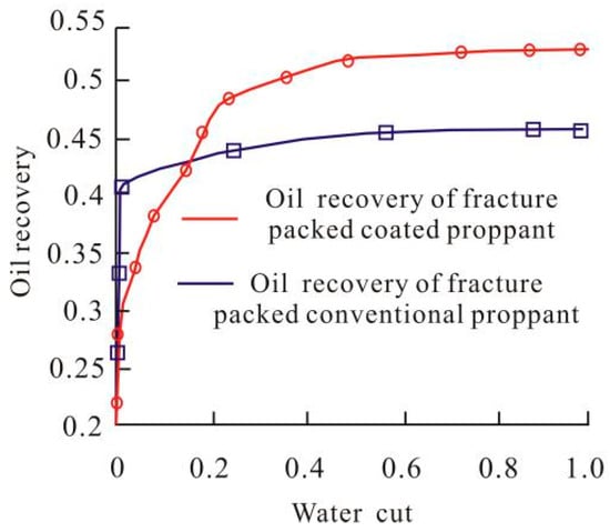 Figure 10 shows the results of oil recovery and water cut. Both development methods had stable oil production in the early stage. Once the water flowed in, the oil production decreased rapidly in the scheme where the fracture was packed with conventional proppant, the oil recovery no longer increased, while the water cut rose rapidly. However, the oil production decreased slowly in the scheme where the fracture was packed with coated proppant, the water cut increased slowly, and the well would not be abandoned for some time. Therefore, the recovery time would be extended. When the water cut reached 98%, the final oil recovery of the fracture packed with coated proppant was 7.7% higher than that of the fracture packed with conventional proppant.
