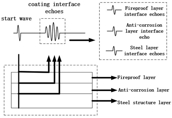 Piezoelectric ultrasonic inspection [4] is distinguished by its high resolution, simple operation, and resistance to external environmental interference; its application in water immersion ultrasonic pulse echo technology has wide application prospects in coating inspection [5]. For the conventional ultrasonic signature scanning technique [6], the vertical incidence of ultrasound reduces the effect of waveform conversion on the echo signal, and the received reflected echo can be directly analyzed to obtain the necessary time-domain information. In the process of assembled steel structure coating inspection, the coating thickness is extremely thin, resulting in the mixing of the reflected echoes from the interface of fireproof coating and anticorrosive coating, which makes it difficult to identify the characteristic information of each coating and impossible to precisely determine the coating thickness, as depicted in Figure 1. In this paper, we use an algorithm to separate the mixed echoes of each coating and accurately obtain the time domain information of each coating for precise thickness measurement.