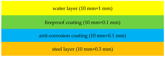 From top to bottom in Figure 4: 1 mm thickness of water layer, 0.1 mm thickness of the fireproof coating, 0.1 mm thickness of the anti-corrosion coating, and 3 mm thickness of the steel. As shown in Table 1, the simulation model for each layer of the medium includes the physical parameters required for ultrasonic detection.