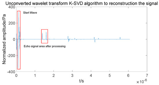 The ultrasonic detection method is chosen for the detection of the coating thickness, and the coating is very thin. A higher detection frequency is used, and the excitation signal pulse width is kept as small as possible in order to improve the detection’s resolution. Therefore, after segmentation, the signal Hankel matrix satisfies the K–SVD requirement that the number of columns exceeds the number of rows. Meanwhile, the matrix formed by splitting the signal matrix according to the pulse width of the excitation signal on the basis of wavelet transform highlights the time-domain characteristics of the signal more and guarantees a better match between the output training dictionary of the K–SVD algorithm and the input signal.
