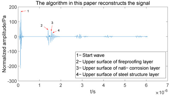 The analysis of the waveform diagram reveals that in the protective coating interface reflection echo, due to the thin thickness of the coating and the large difference in the acoustic properties of the two layers of the coating, the ultrasonic waves will be reflected and transmitted between the coating and will be superimposed on each other to interfere with the waveform distortion, causing the final received signal to differ from the ideal echo signal. As shown in Figure 6, the waveforms of fireproof and anticorrosive coatings have been mixed, resulting in distortion of the entire waveform. Inability to effectively distinguish the time domain location of the echo signal peaks for individual coatings, the signal must be reconstructed after decomposition using the algorithm studied in this paper. Then, the time-domain information of each coating is obtained according to the amplitude of the reconstructed signal, and the thickness of each coating is calculated accordingly.