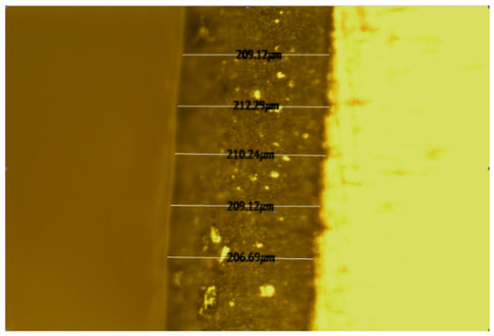 In the metallographic test results depicted in Figure 12, the darkest color represents the anticorrosive layer coating, and the color on the right represents the substrate. In the resulting metallographic image, five random locations were chosen to measure the thickness of the anticorrosive layer. Then, the average thickness obtained from metallographic testing was considered as the true thickness of the anticorrosive coating, and the measurement results are summarized in Table 3.