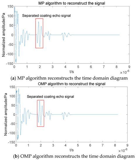 As can be seen in Figure 13, the pulse width of the interfacial echo obtained by focusing the water immersion probe onto the specimen surface is too wide and will completely drown out the coating detection signal, so the coating detection signal is extracted between the primary and secondary reflection echoes at the steel interface. The specimen’s thickness is measured with vernier calipers, and when combined with the speed of sound in the steel, the primary and secondary reflected echoes at the interface of the steel can be calculated as depicted in Figure 13 at positions 1 and 2. Multiple interface echo signals of the anticorrosive layer and the primary echo of the steel are obviously mixed, and there are abnormal wave peaks between positions 1 and 2. Based on the sound velocity in the anticorrosive layer and the coating thickness of the preset specimen, it is known that these abnormal signal peaks should be the multiple interface echo signals of the coating. Now, the mixed signals are separated using the algorithm proposed in this paper, in which the ultrasonic wave wavelength propagated in the anticorrosive layer is calculated according to the equation based on the average ultrasonic wave speed of 2095 m/s in the anticorrosive layer and the excitation frequency of 10 MHz. Then, the detection resolution is about half wavelength, i.e., 104.75 μm. Additionally, 104.75 μm needs to be sampled approximately ten times at the sampling rate of 200 MHz. It takes about ten times of sampling, so the signal segmentation index in T = 10. Figure 14 compares the separation results of the MP algorithm, the OMP algorithm, and the mixing separation effect of the K–SVD algorithm without wavelet transform.