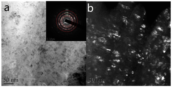 TEM images and corresponding SAED patterns obtained at the site 10 μm from the surface of the SFPB AISI 5120 steel side: (a) bright field image and corresponding SAED pattern insets; (b) dark field image.