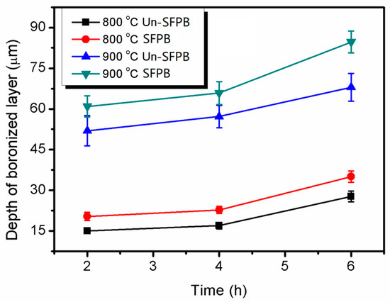 The relationship between the boride depths in the SFPB and the un-SFPB surfaces of the AISI 5120 steel samples and the boronizing temperature and time are shown in Figure 6. It can be seen that the thickness of the boride layer continually increased with the extension of the boronizing temperature or time. However, the boride layer thickness in the SFPB surface increased faster than that in the un-SFPB surface.