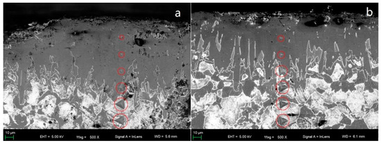 When the second-step boronizing time increased from 2 h (Figure 10a) to 6 h (Figure 10b), a denser and thicker boride layer formed in the surface of the sample. It could be interpreted that the longer time helped to generate the Fe2B phase during the incubation period, which caused the deep and large area cross-linking [19].