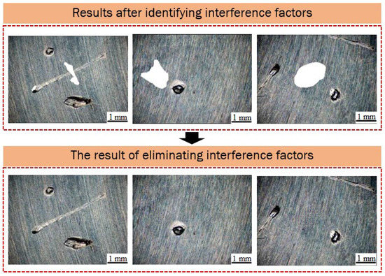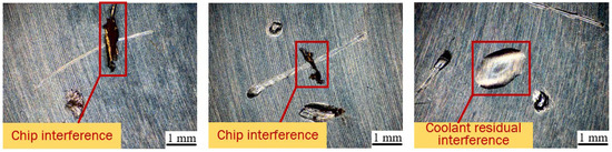 The above detection method has achieved a good detection effect, but it ignores the adverse effects of interference factors in the actual cutting environment. As is well known, due to the effects of the actual industrial cutting environment, mechanical parts can easily produce stains or cutting surfaces contaminated by interference factors (coolant residue or chips). These interfering factors can cover the defect location and affect the sustainability detection of the surface. The surface defect images covered by interference factors are shown in Figure 2.