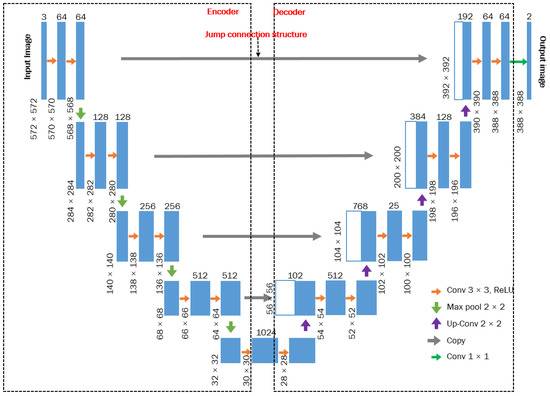 The Unet model comprises of two symmetrically composed components, namely the encoder and the decoder, which support each other’s function, as depicted in Figure 3. The encoder is used to extract the feature information of the target image, which consists of convolution and maximal pooling. The decoder’s role is to integrate the effective feature layer extracted by the encoder. This is achieved by up-sampling and stacking the feature layers using the feature fusion technique. In addition, Unet also uses the jump connection structure to transmit the feature map extracted by the encoder into the decoder of the corresponding scale, thus strengthening the feature extraction ability of the model and achieving high segmentation accuracy. Finally, based on the feature recognition results, category labels are assigned to each pixel in the image.