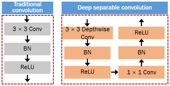 In traditional convolution, all channels of the image are convolved by the same convolution kernel. Therefore, when processing inputs with a high number of channels, traditional convolution fails to extract detailed features from each channel layer. In depth-separable convolution, each channel of the image is convolved by different convolution kernels. Depth-separable convolution can effectively reduce the number of parameters in the operation process and play a key role in streamlining the model. The network structure of traditional convolution and depth-separable convolution is shown in Figure 4. Depth-separable convolution is composed of a deeply separable block and ordinary convolution blocks (1 × 1). The convolution kernel size for deep separable convolutions is 3 × 3. Ordinary convolution can adjust the number of channels. Batch Normalization (BN) makes the distribution of eigenvalues per each network as stable as possible through the normalization operation. ReLU is the most widely used activation function, and its function is to increase the nonlinear relationship among the various feature layers. The combination of BN + ReLU can suppress the gradient explosion occurring during the network model training and speed up the training speed.
