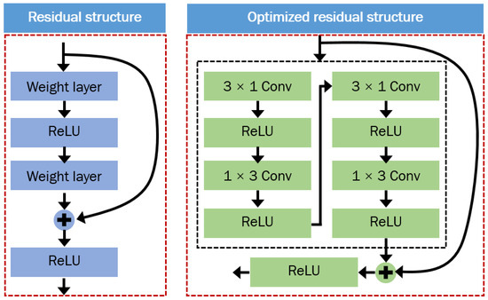 As the convolution depth increases, the model training produces more and more errors, thus reducing the performance. Therefore, this section adds the residual structure to compensate for the decline of the model performance. Residual structure can not only solve the problem of performance degradation, but also reduce the probability of gradient problem and improve the ability of the model to segment interference factors in the image. Figure 5 illustrates the residual structure, which consists of fast connections and identity maps. In practical industrial applications, a single layer of residual blocks may not suffice. Therefore, to improve the performance of the model in segmenting interference factors, the residual structure is optimized: the two 3 × 3 convolution layers are replaced with the structures of 3 × 1, 1 × 3, 3 × 1, and 1 × 3.