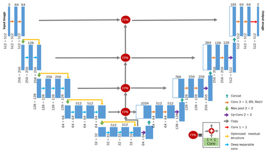 The encoder component of the Unet model [26] utilizes a traditional convolution layer that may lead to issues such as more convolution operations, large computation, and a single activation function. Large parameter numbers also easily lead to overfitting of models when dealing with tasks with small sample sizes. In order to improve the detection accuracy of the Unet model, it is improved in this section. In this section, the traditional convolutional neural network of the backbone feature extraction network of the Unet model is replaced by a deep separable convolution to reduce the number of parameters of the network. At the same time, the Feature Pyramid Network (FPN) [27] is introduced to optimize the jump connection part of the model to improve its segmentation accuracy. To avoid the problem of gradient disappearance or bursting with the model depth, the residual structure [9] is introduced.