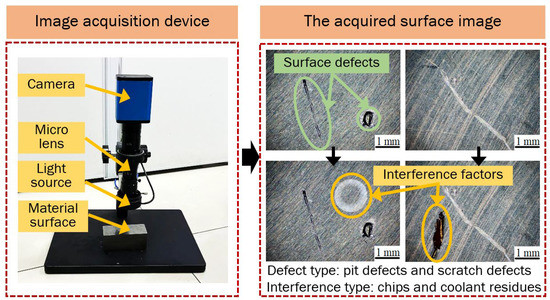 This paper uses a large number of cutting surfaces as the basis for the study. These cutting surfaces are obtained experimentally. In the process of cutting experiments, the surface defects are often covered by interference factors in the environment. Firstly, a large number of superalloy parts are obtained with cutting experiments. The material used in the milling experiments is GH4169. The type of cutting tool is a ceramic knife. This process selects the clean cutting mode of high-speed dry milling. The machine tool is the CNC machining center of DMG company in Germany. Then, the cutting surface images of the superalloy parts are acquired using the image acquisition device. Among them, the image acquisition is based on the built image data acquisition device, which is composed of an industrial camera, a micro lens, and light sources. As shown in Figure 8, the parts are placed on the workbench and the surface images of different parts are collected using the image acquisition device. For the surface at the same location, the images are acquired twice. One is the surface image without environmental interference; the other is the surface image covered with environmental interference factors. This paper assumes that interfering factors are chips and coolant residues often present in the cutting environment, and the types of defects are pit defects and scratch defects. At the same time, the interference factors account for less than 40% of the surface image. The surface defect image dataset with interference and surface defect image dataset without interference are obtained by the acquisition device. The images in these datasets are used as data training and testing data in deep learning models. In this paper, the network model is trained and tested using PyCharm software. The surface size of the image is 640 × 480 pixels. The actual field of view of the image is 6.425 mm × 4.819 mm. The acquired surface image is shown in Figure 8.