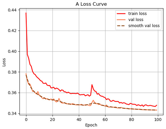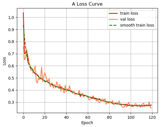 Segmentation is treated as a dichotomous problem, where the interference factor is in the foreground and all other objects are in the background. To reduce the risk of overfitting the model, data enhancement is performed on the original image data, including horizontal flipping, vertical flipping, and Gaussian noise. A total of 1000 images are randomly selected from the two datasets. The data is increased from 1000 images to 5000 images, where the data amount of the training set is 4500 images, and the rest is used as the test set. The labelme tool is used to label different interference regions in the defect images before training. The model selects Adam as the optimization algorithm for the learning rate, where the initialized learning rate is set to 4 × 10−4. The loss curves of FPN-DepResUnet model are shown in Figure 9.