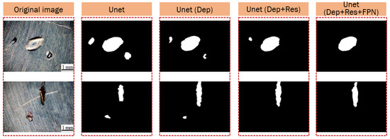 Compared with the Unet model, the MIoU and MAP of the Dep-Unet model increased by 2.03% and 1.80%, respectively, and the Params decreased by 45.48%, which verified the effect of deep separable convolution on reducing the number of parameters; the MIoU and MAP of DepRes-Unet model increased by 3.66% and 3.15%, respectively, and Params decreased by 33.11%, which verified the improvement effect of residual structure on the feature extraction ability of backbone network; MIoU and MAP of FPN-DepResUnet model increased by 5.86% and 5.77%, respectively, and the Params decreased by 29.90%, which proved that FPN can improve the segmentation effect of the model. Experimental analysis shows that the three improvements proposed in this section improve the detection performance of the model. After calculation and testing, the detection speed of the model for a single surface image is 0.85 s.